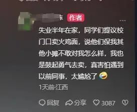 视频发布者称,自己失业在家半年,同学们提议在校门口卖火鸡面,“我也是鼓起勇气去卖火鸡面,真害怕遇到前同事,太尴尬。”